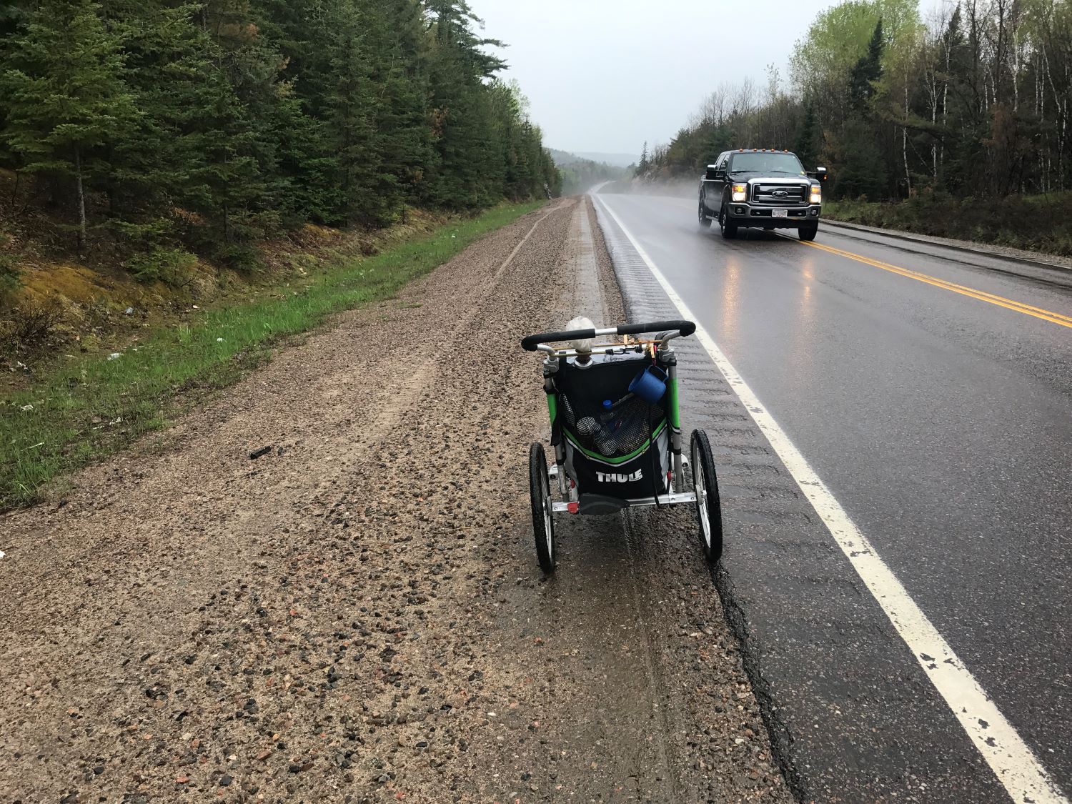 I thought maybe I had made a mistake and that carrying a backpack was a better way to go. Walking through this dirt on the shoulder of the highway with a backpack is certainly easier than pushing a stroller through it. But then I realized I still had a pretty good pace going, even with the extra work. I’d still be walking about one km/hour slower with a backpack, which, over the length of Canada, could be a month’s worth of walking. So, I decided to stick with the jogging stroller.
